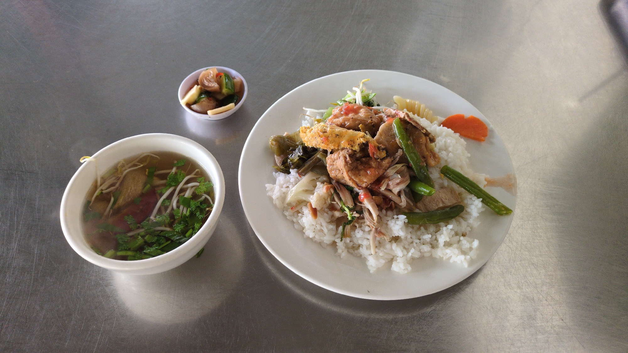 The image captures a meal placed on a scratched metallic table surface, likely located in Tuy Hòa, Vietnam. A large white oval plate, positioned slightly right of center, contains a portion of white rice topped with various components: pieces of cooked meat, including some with skin and some shredded white meat; green long beans and leafy greens; a piece resembling a fried egg or battered item; and a garnish of an orange carrot slice and a few white macaroni pasta pieces. Red sauce or dressing is visible on some of the toppings. To the left, a white oval bowl holds a clear broth soup containing bean sprouts, chopped green herbs, and slices of reddish and pale brown meat. A small white circular bowl, situated towards the top-center, contains pickled vegetables, notably green cucumber-like pieces, small yellowish fragments, and some reddish elements, all submerged in a clear liquid. The metallic table surface exhibits numerous linear scratches and reflections from an overhead light source, with a soft shadow cast by the soup bowl. No individuals are visible.