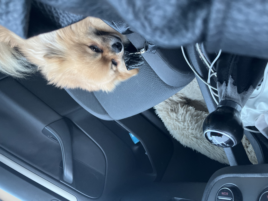 - "Inside a car, a small, fluffy dog with light brown fur rests on the passenger seat" by FM-vTiXm2, licensed under CC BY 4.0