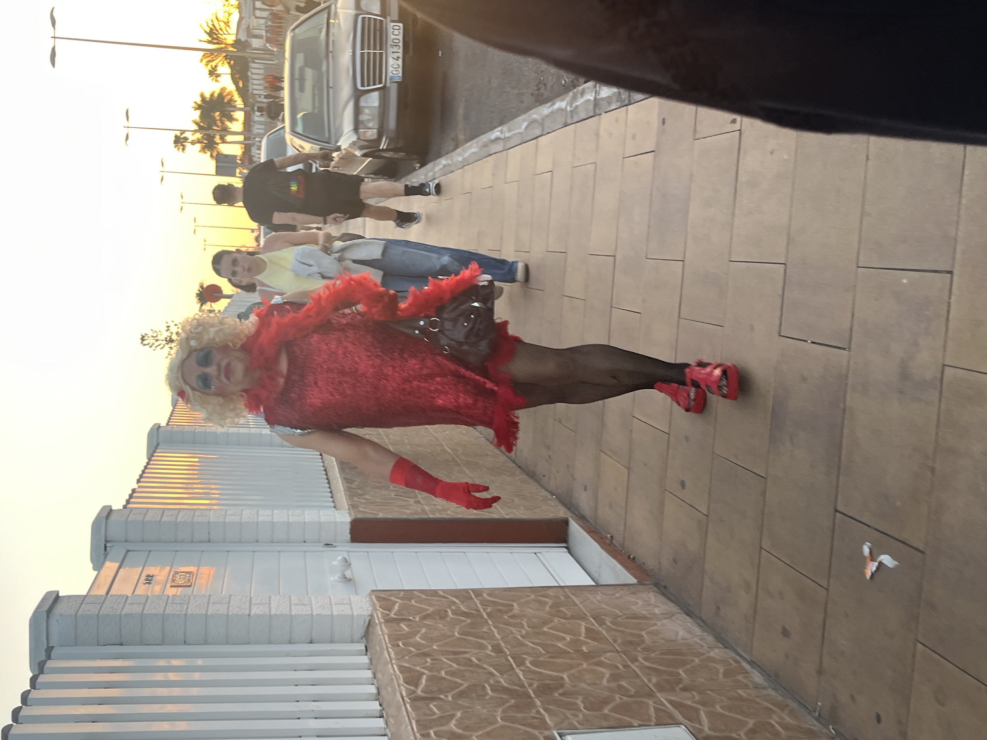 A person dressed in drag wearing a red dress with a feather boa, fishnet stockings, and red high heels is walking on a sidewalk in San Bartolomé de Tirajana, Spain