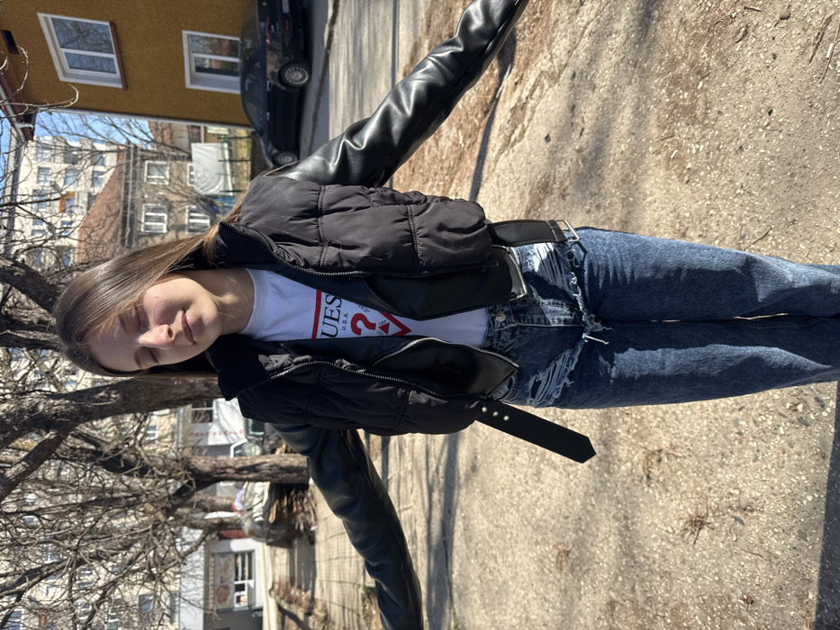 The image displays a young female subject standing outdoors in Cherven Bryag, Bulgaria, on a clear, sunny day. The individual is positioned centrally, facing slightly towards the viewer with her eyes closed and a neutral facial expression. Her long, straight brown hair falls over her shoulders. Both arms are slightly extended outwards from her body. She wears a white short-sleeved t-shirt featuring a red and blue "GUESS U.S.A." logo centrally on the chest. Over the t-shirt, she has a black, cropped jacket characterized by a quilted, padded torso and smooth, faux leather sleeves. The jacket includes a prominent black strap with three silver stud details and a buckle, hanging vertically from the left side of her waist. Her lower attire consists of dark blue, high-waisted, wide-leg denim jeans, significantly distressed with horizontal rips visible across the upper thigh and crotch regions. The background reveals an urban environment. To the left, bare deciduous trees with visible branches are present, behind which stands a multi-story building with light-colored walls and multiple windows, and a partially visible ground-level storefront. To the right, a two-story building with yellow stucco exterior and white-framed windows is visible. A dark-colored sedan is parked on an asphalt or paved street segment to the right of this building. The ground directly beneath the subject is a light-colored, possibly concrete or gravel, surface with some scattered debris. Strong, overhead sunlight casts distinct shadows, indicating a bright, clear sky, which is visible in the upper sections of the frame.