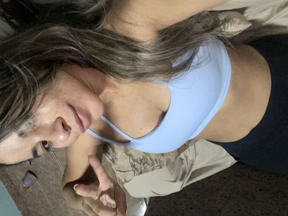 The image depicts a single adult female in an indoor setting, located in Anápolis, Brazil. The subject, with medium skin tone and long, multi-toned brown hair, looks directly at the camera with a slight, closed-mouth smile. She wears a light blue athletic crop top with thin straps and dark leggings. Her left arm is raised, with the hand forming a two-finger gesture (V-sign). The background features a section of brown tiled flooring in the upper left, upon which two light-colored, possibly purple, slippers or sandals are positioned. A light-colored fabric with a subtle pattern is visible behind her left side and extends towards the lower left. The scene is illuminated by ambient, relatively dim light.