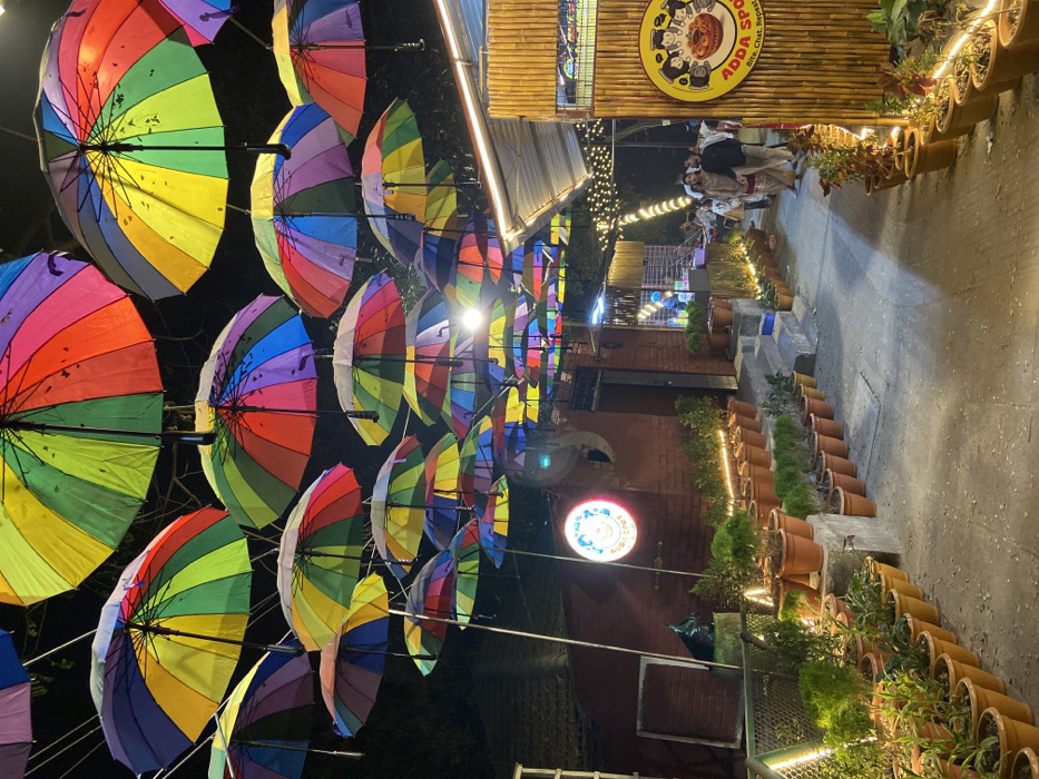 An outdoor scene at night features colorful rainbow umbrellas suspended overhead. To the right, a pathway is lined with terracotta pots filled with greenery and small lights. Two people stand in the distance. A sign that says "ADDA SPOT" is visible at the top right and another round sign is visible along the path. The umbrellas create a vibrant and whimsical atmosphere.