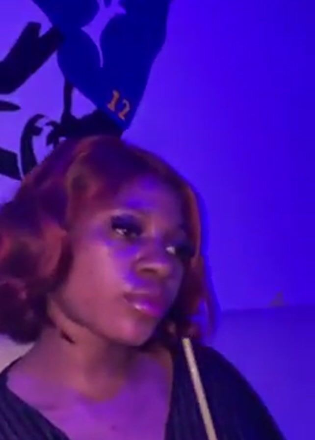 A woman is drinking from a straw. She has auburn shoulder-length wavy hair and wears a black, striped V-neck top. She has on noticeable false eyelashes and shiny lip gloss, and a nose ring. A blue light illuminates the room, and behind the woman there's a poster with the number "12" on it. The woman's expression is serious. The camera angle is slightly low, looking up at the woman.