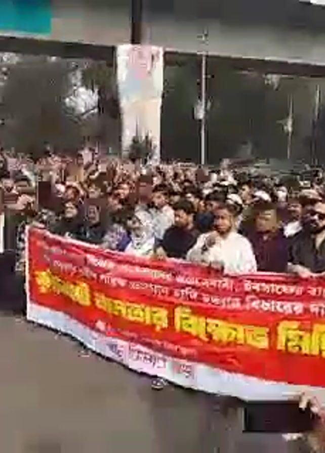 A large crowd of people is marching down a city street, holding a long, red banner with white writing. The banner appears to be in Bengali script. The people are diverse in age and attire, with many men wearing casual clothes and some sporting beards. Some people are recording the event with their mobile phones. An overhead pedestrian bridge is visible in the background, adorned with a large poster. The general atmosphere suggests a political demonstration or protest.