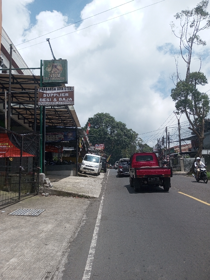 The image depicts a street scene under a partly cloudy sky. While the prompt specifies Ura-Dozhi, Bhutan, visible signage in the image, such as "Prakarsa Jaya Steel" and "Supplier Besi & Baja," is written in Indonesian, indicating a location in Indonesia. The scene features an asphalt road with a solid white line defining the shoulder or parking area on the left, and a broken yellow line further right, suggesting a two-way street. On the left, a concrete sidewalk or raised area fronts a commercial building. A dark metal gate or fence is visible on the far left. Above the building's entrance, under a metal-framed awning, hangs a square green sign with "SBM" and a logo, and below it, a brown rectangular sign reading "PRAKARSA JAYA STEEL SUPPLIER BESI & BAJA" with a phone number. Red banners or posters are visible within the covered area. A white compact van is parked partially on the raised concrete area, angled towards the road, on the left side of the street. Further down the street, other vehicles are parked or in traffic. In the foreground, a red pickup truck with a flatbed is traveling away from the viewer, displaying a license plate "F 8411 TE." Ahead of it, multiple cars are visible in traffic. On the far right side of the road, a person wearing a white helmet and light-colored clothing is riding a white motorcycle, also moving away from the viewer. Utility poles with multiple overhead wires run along the right side of the street. Large trees with dense foliage and taller, sparser trees are present on both sides of the road, contributing to the semi-urban environment.