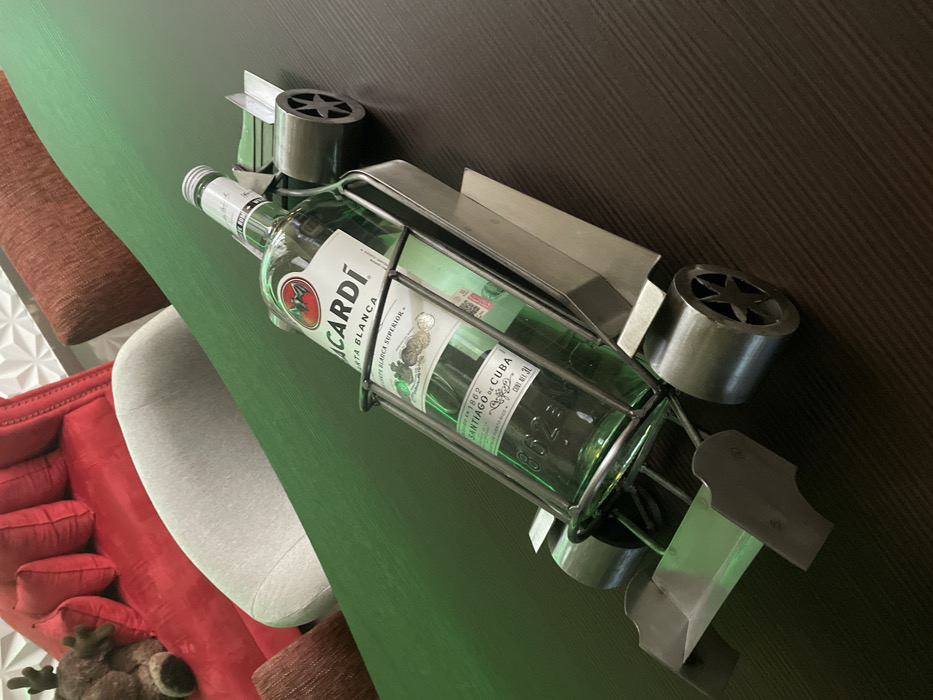 A Bacardi Carta Blanca rum bottle sits in a metal race car-shaped holder with wheels and rear wing details. The bottle is mostly empty, with a green hue inside. It rests on a green surface near a red sofa, a light gray chair, and a brown table. The overall scene has a tilted perspective.