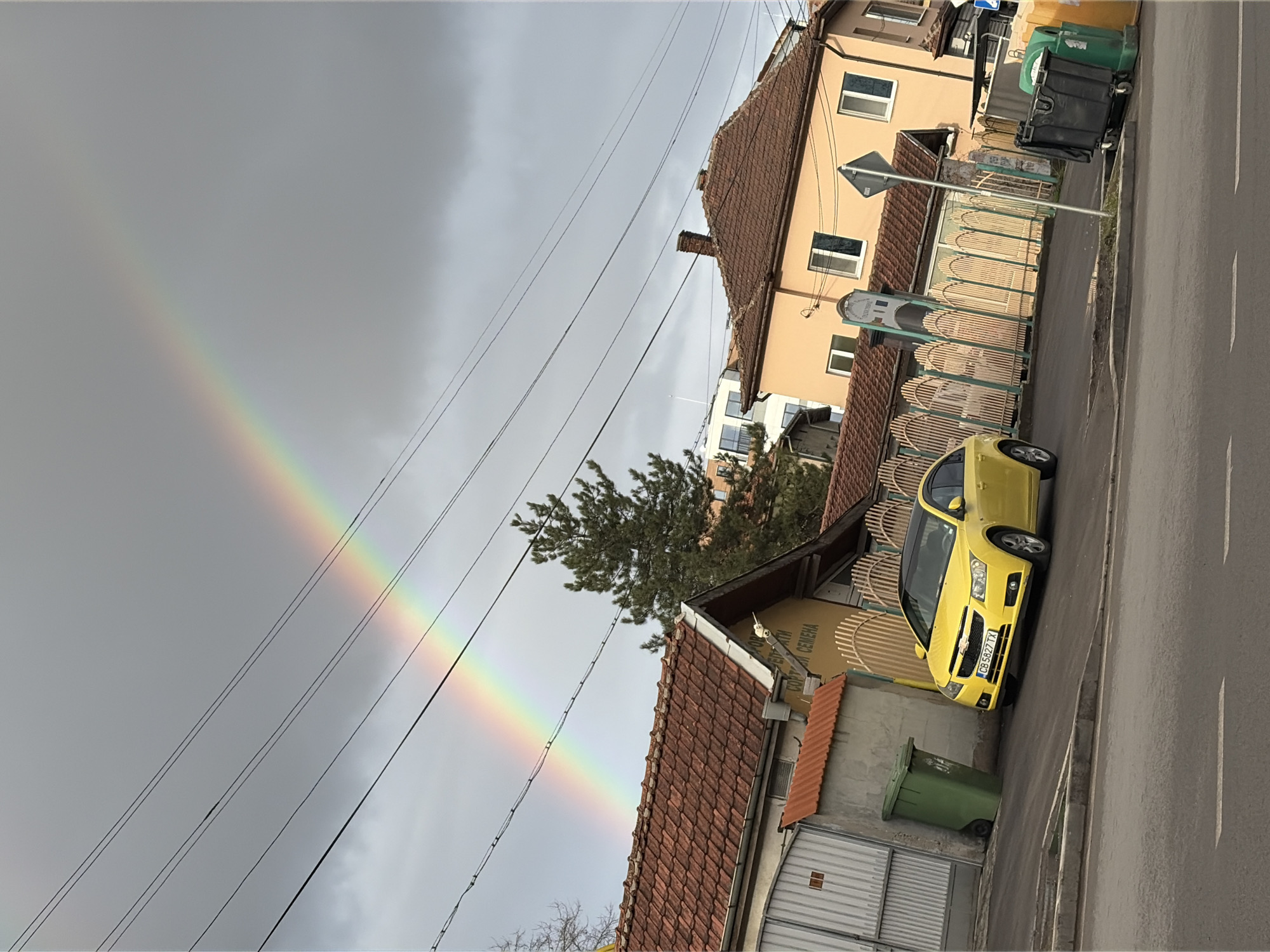 The image captures a street scene in Kostinbrod, Bulgaria. A vibrant rainbow arcs across the sky, terminating near a residential area. A yellow car is parked on the side of the road near a green trash bin. Buildings of varying heights and architectural styles line the street. Electrical wires crisscross the sky.