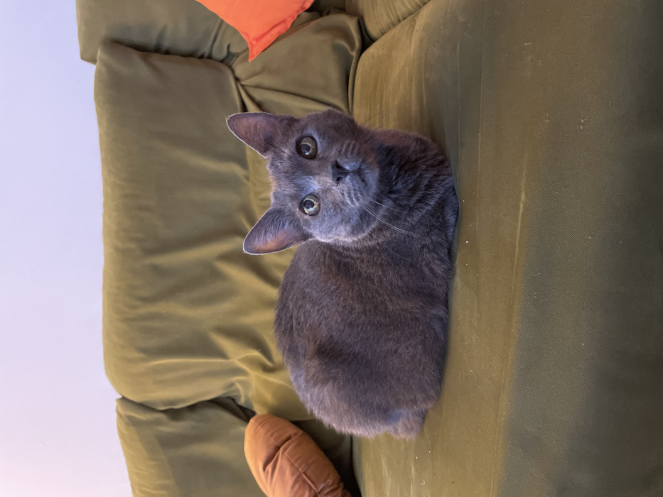 - "A blue-grey domestic cat is situated in a 'loaf' position on an olive-green fabric sofa, within a residence in the city of Madrid, Spain" by FM-E8Nbf1, licensed under CC BY 4.0
