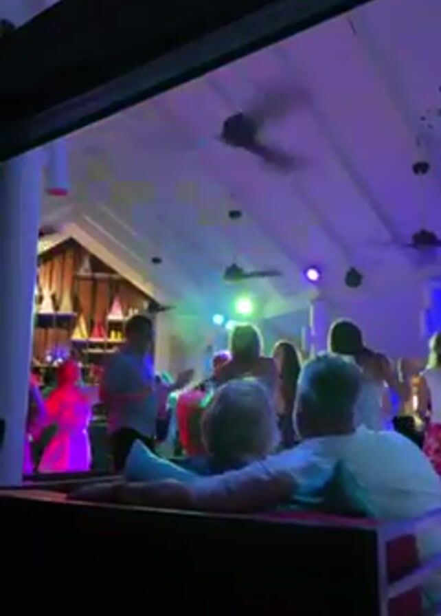 The scene takes place in a lively indoor venue with a white vaulted ceiling equipped with several rotating ceiling fans. The room is illuminated by a dynamic array of multicolored lights that shift between green, purple, and blue, creating a vibrant atmosphere for a group of people dancing and enjoying themselves. In the foreground, a couple relaxes on a cushioned bench, observing the lively scene before them. The background reveals a bar area with a display of various drinks and decorations. The overall ambiance suggests a celebratory or social gathering in a tropical or resort-like setting.