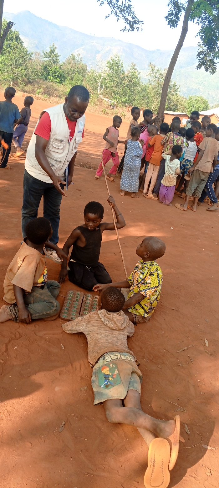 The image captures an outdoor scene in Ngalula, Democratic Republic of the Congo, featuring one adult male interacting with approximately 15-20 children