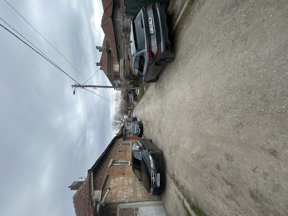 This image depicts a narrow, unpaved residential street in Dolna Oryahovitsa, Bulgaria, under an overcast sky