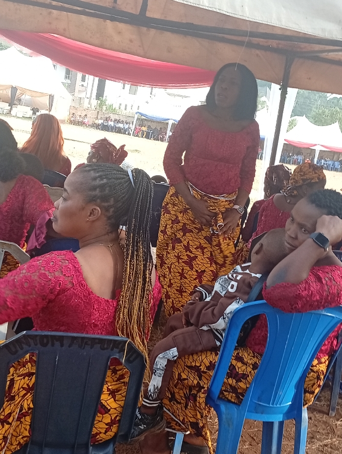 An outdoor gathering is depicted under a large temporary canopy with a white exterior and red fabric drapes, located in Nkwelle, Nigeria. The ground is dry earth. In the foreground, three females and one child are visible. On the left, a female is seated in profile, looking left, wearing a red lace long-sleeved top and a yellow, brown, and black patterned wrapper skirt. Her hair is dark with yellow-toned braids in a ponytail. A blue plastic chair with "UNTOM AFFUND" text is beneath her. Centrally, a standing female faces slightly right, wearing a matching red lace top and patterned wrapper skirt; her mouth is open, and her dark hair is shoulder-length. To the right, a seated female wears a matching red lace top and wrapper skirt, looking downward while holding a young child on her lap. The child wears a brown and white long-sleeved top, brown pants with white patterned sections, and dark sneakers, resting against the woman's left shoulder. Additional individuals, primarily females in similar attire, are partially visible in the mid-ground. In the background, multiple white tents shelter numerous people seated in rows. Multi-story buildings are visible in the distant background.