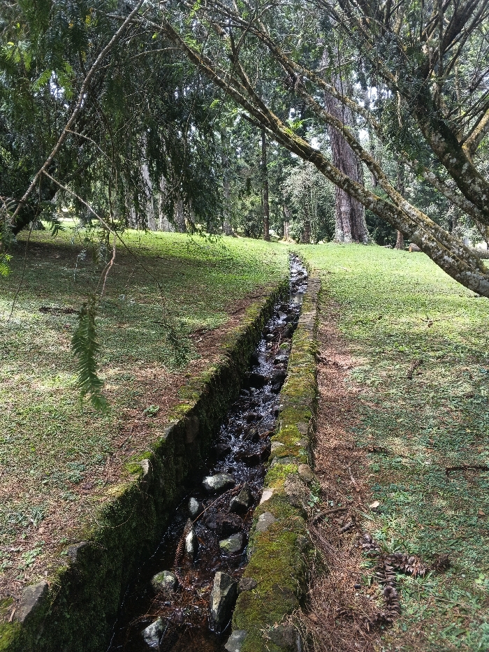 The image displays an outdoor environment in Tapaiteng Uesa, Bhutan, centered on a narrow, stone-lined water channel extending from the foreground into the background. The channel, approximately 0.5 meters wide, contains flowing dark water, interspersed with numerous stones and organic debris, including pine needles. The channel's stone walls are significantly covered with green moss. On either side of the channel, the ground consists of green grass with visible patches of exposed brown soil and scattered dry pine needles. The scene is heavily treed, with dense foliage overhead and a thick forest evident in the mid-ground and background. A large tree with thick, light-colored branches partially obscured by moss is present in the upper right quadrant, while dark green, pendulous foliage hangs into the upper left. A notably thick-trunked tree stands prominently in the mid-background, slightly right of the channel's centerline. No human or animal subjects are visible. The scene is illuminated by natural daylight.