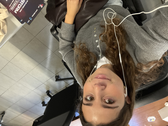 A young woman with curly brown hair wears a grey cardigan and white earbuds. She sits in a black office chair with a brown leather cushion, looking directly at the camera. A flyer with the word "STORM" is visible on a nearby white-tiled floor. A wooden desk is on the right, with a small white object and another item with lettering on it. The room appears to be an office space.