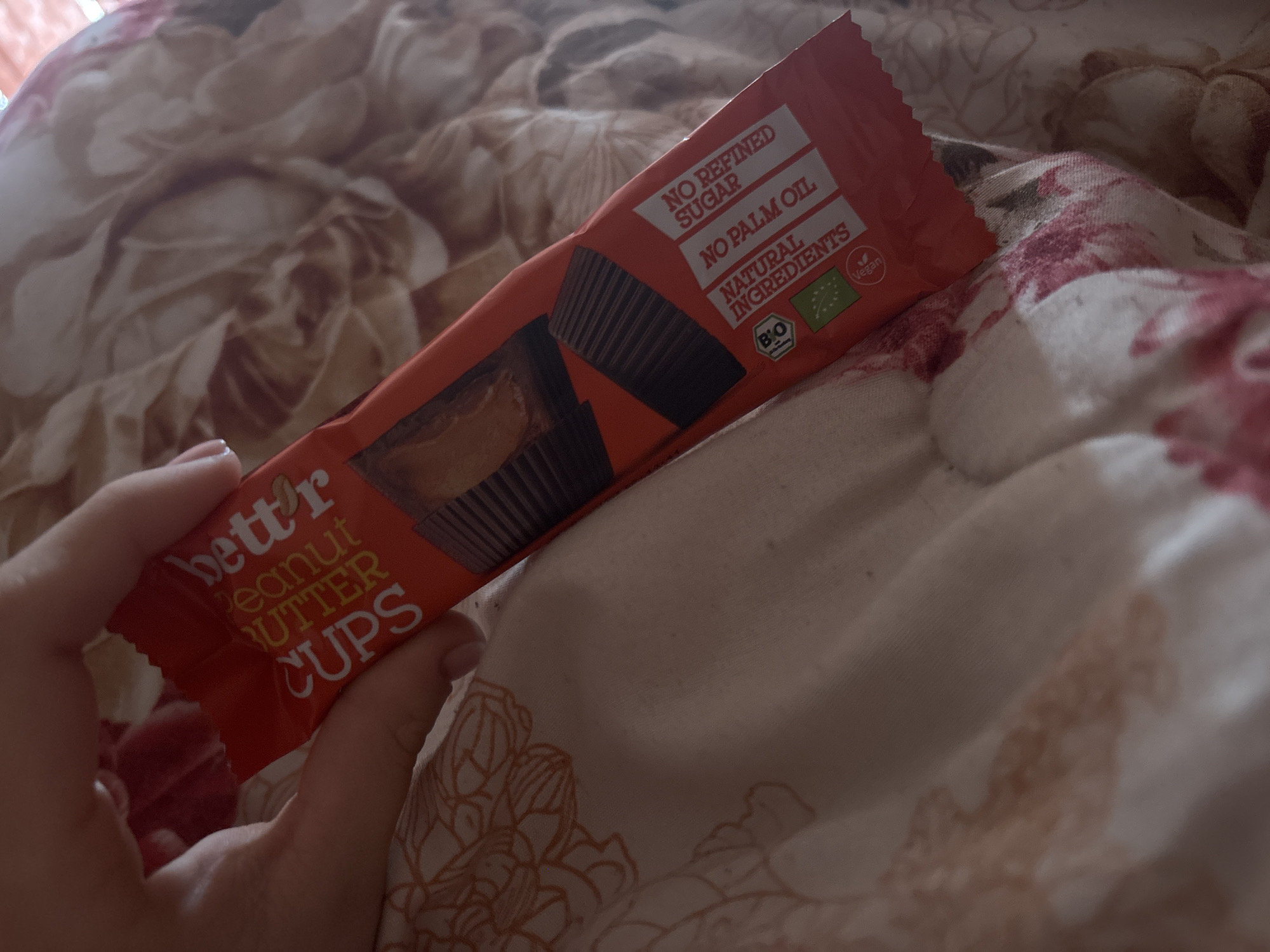 A hand holds a package of "better peanut butter cups" on a floral patterned fabric