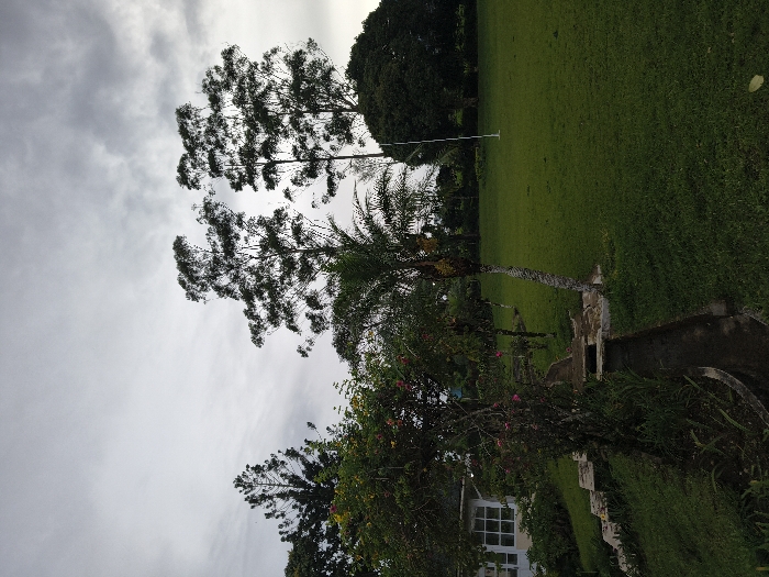 The image displays an outdoor scene in Unknown, Vietnam, under an overcast sky. The foreground features a concrete drainage channel running from the lower-left, extending towards the center and slightly right. Dense green grass and various low-lying plants border this channel. To the far left, a white building with multiple white-framed windows is partially visible, obscured by a dense bush exhibiting both red/pink and yellow blooms. A manicured green lawn occupies the majority of the mid-ground and extends into the background on the right. A slender palm tree, bearing clusters of orange-brown fruit, stands on the left edge of this lawn, near the channel. In the background, several tall trees dominate the skyline against a gray, cloudy sky. Two prominent, tall trees with dense, dark green canopies are positioned centrally, flanked by a pine-like tree on the left and a large, rounded bushy tree on the far right. A tall, white pole is erected in the middle of the lawn towards the background. No individuals or animals are present in the depicted scene.