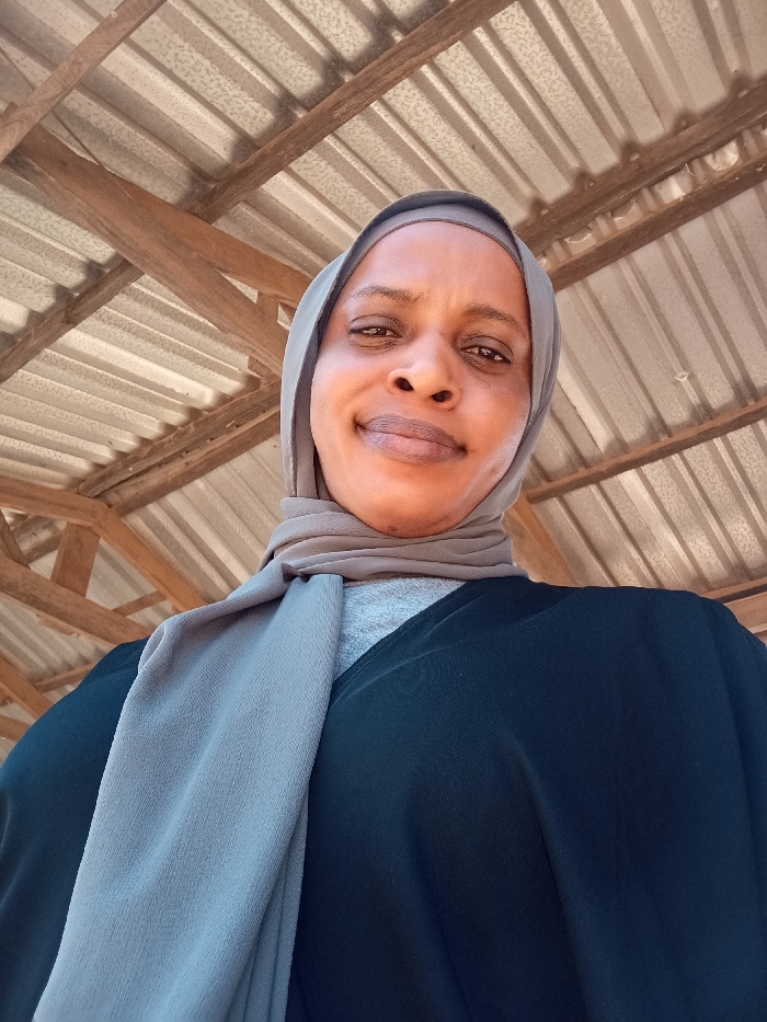 An upward-angled, chest-up photograph captures a single adult female in Makera, Nigeria. The woman, with light brown skin, dark eyes, and a faint, closed-mouth smile, looks directly at the camera. She wears a light grey hijab covering her head and neck, and a dark, loose-fitting outer garment over a lighter grey undergarment. The background consists of a corrugated metal roof structure supported by multiple wooden beams and rafters, indicating an outdoor or semi-enclosed setting. The scene is illuminated by ambient daylight, casting no distinct shadows on the subject or the background elements.