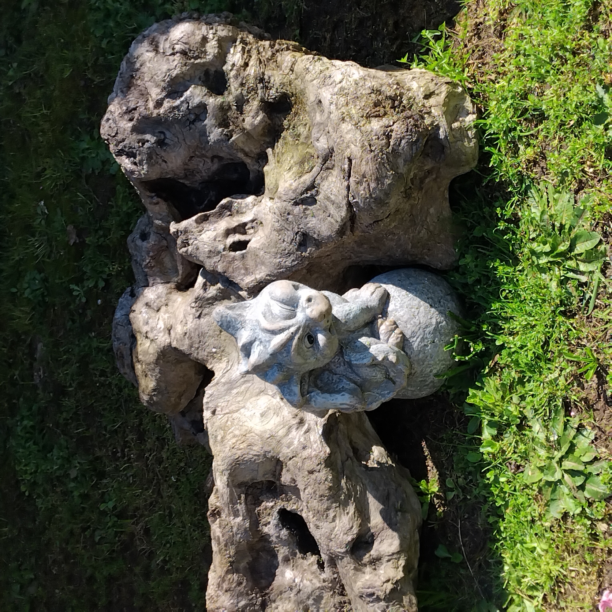 The image depicts a garden statue placed between two large, weathered rocks on a patch of grass