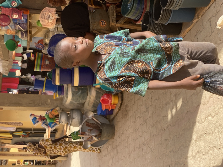 A young boy stands outdoors, wearing a patterned green and brown shirt and grey pants, holding a plastic bag. He looks up and to the left. Behind him is a vendor's display with various household items, including buckets, pots, and plastic containers in assorted colors. Part of another person, wearing a patterned yellow and brown garment, is visible at the bottom of the frame, and a black head covering appears among the displayed items. The ground has a patterned brick texture.