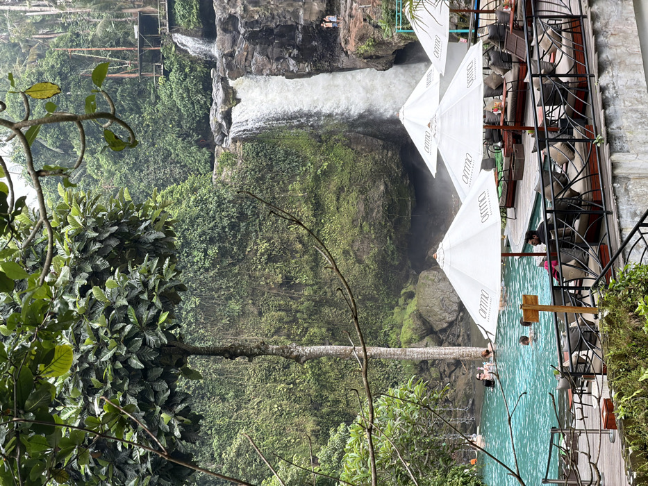 A waterfall cascades into a turquoise pool, flanked by lush green foliage. White umbrellas provide shade near a restaurant with metal railings and wooden seating. People swim and enjoy the water. The scene is taken from a slightly elevated perspective with surrounding greenery.