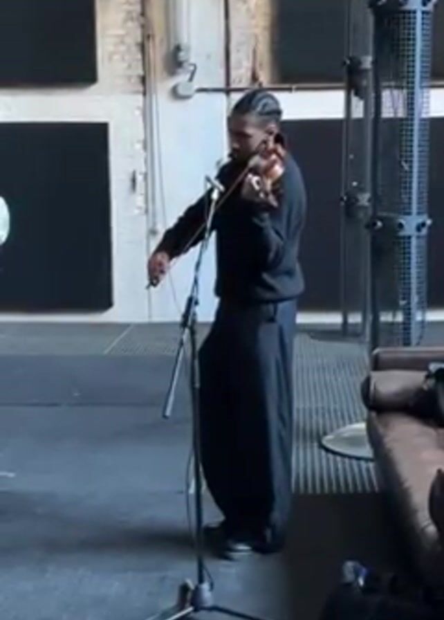 A man wearing a black sweater and extremely wide black pants stands in what appears to be a recording studio. He is playing a violin. A microphone on a stand is in front of him. The room has exposed brick walls, a grey tiled floor, and tall metal structures. A dark leather sofa is in the background.