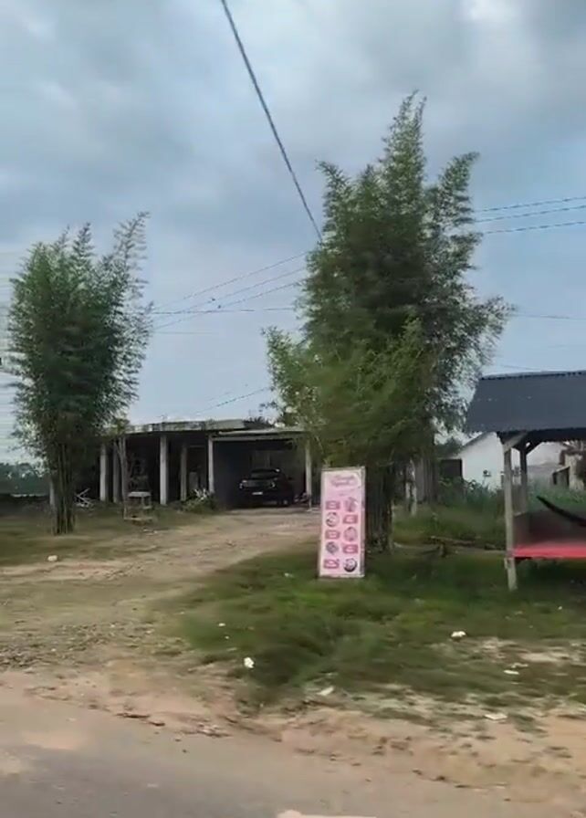 A view of a rural area under an overcast sky, taken from a moving vehicle. The shot shows a roadside scene with sparse vegetation and a mix of buildings, some under construction and others appearing to be abandoned or in disrepair. A weathered sign reading "SHIMIZO UD PUTRA JAYA ABADI" is visible. A small, open-sided structure with a hammock hangs in the background. The road is paved but shows signs of wear and tear. No people are clearly visible in the video.