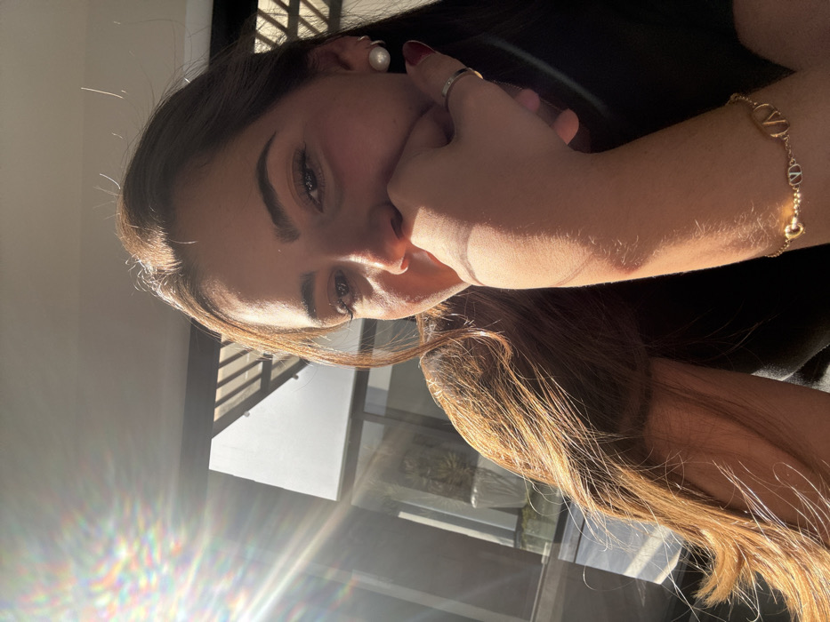 A young woman is posing for the camera, tilted on her side, with her hand lightly touching her face. She is wearing a pearl earring and a dainty gold bracelet with multiple V charms. Sunlight floods in from a nearby window, casting a warm glow over her face and hair. Her fingernails are painted with red nail polish and she is wearing a simple metal ring. The background is a mix of light and dark shadows, with glimpses of window frames.