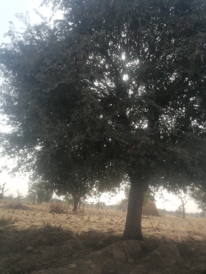 A sun-drenched field is populated by scattered trees. The foreground is dominated by a large, leafy tree casting a strong shadow. Its trunk is thick and sturdy, rooted in the dark soil. In the distance, other trees dot the landscape, and a hazy sunlight filters through the foliage. The dried grass of the field adds a muted, earthy tone to the scene.