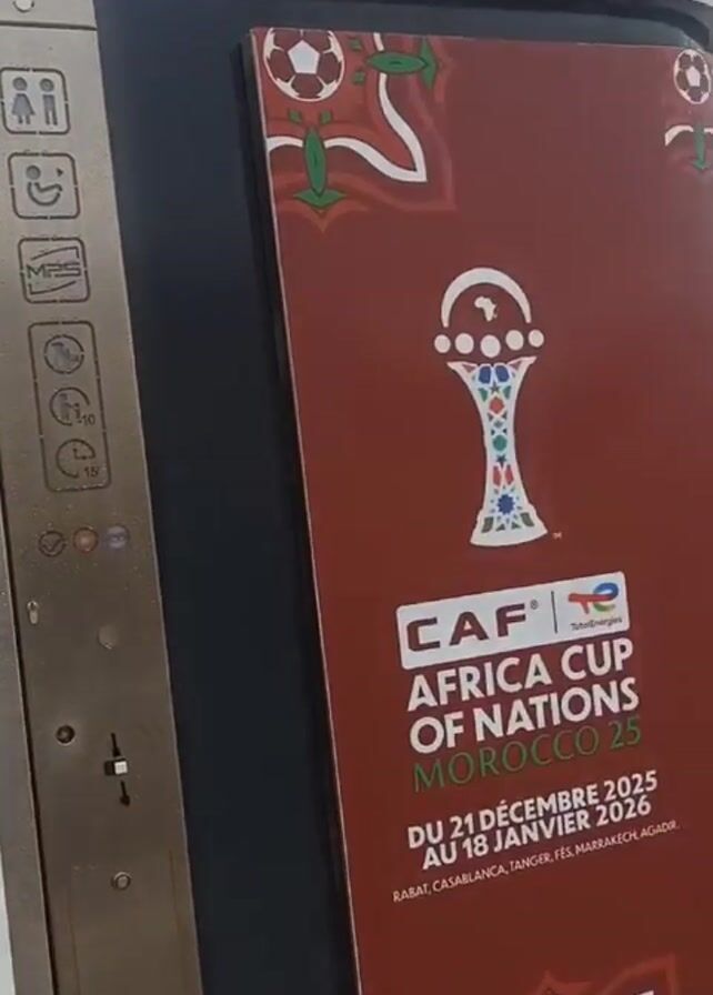 street scene on a rainy day. Initially, there is a public toilet with an advertisement poster for the "CAF Africa Cup of Nations Morocco 2025" next to it. The poster features the Africa Cup trophy and lists cities like Rabat, Casablanca, Tanger, Fes, Marrakech, and Agadir. The view then shifts to a broader scene of a street with palm trees and a minaret in the background. A large billboard displays an advertisement with the phrase "Activez mode المشجع" (Activate supporter mode). The scene continues to show the rain-soaked streets, and cars drive through puddles. The ground is wet, and reflections of the sky and surroundings are visible in the water. Other billboards and street signs are also visible in the background.
