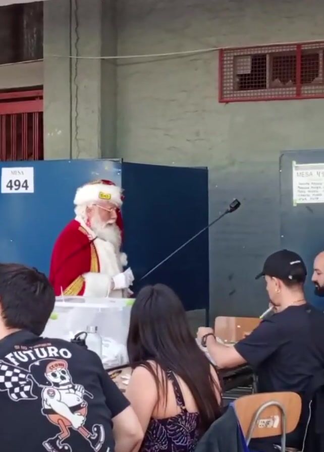 Santa Claus working at a table inside a building. He is sitting at a table marked "Mesa 494" (Table 494) and appears to be officiating or overseeing some kind of process, possibly an election or registration. There are other people sitting at the table across from him, writing or filling out paperwork. A microphone stands between Santa and the people across the table. The environment looks like a school or community building with gray walls. There are windows with metal grids behind them. A banner with a website address is visible in the upper left corner of the frame.
