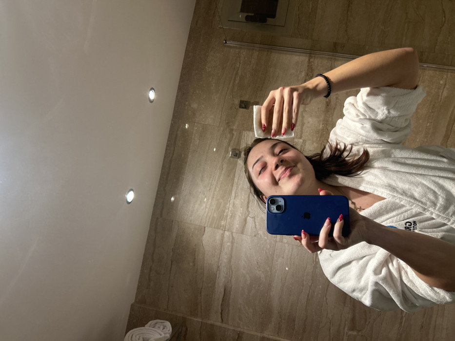 A woman in a white robe holds a blue iPhone in her right hand, and in her left hand, she holds a cotton pad. She smiles as she takes a selfie in a bathroom. The background features a beige-tiled wall and ceiling, along with recessed lighting. Her fingernails are painted with red dots. The phone case is a solid blue color. A black bracelet is on her left wrist.