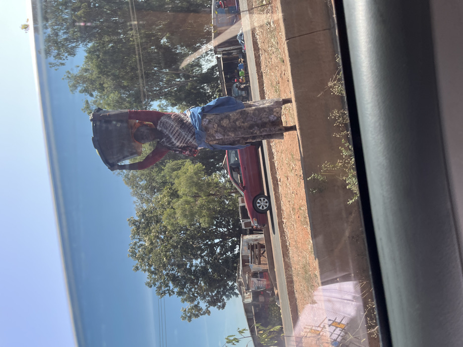 The image, captured from within a vehicle, displays an outdoor daytime scene in Kuru, Nigeria, under a clear blue sky