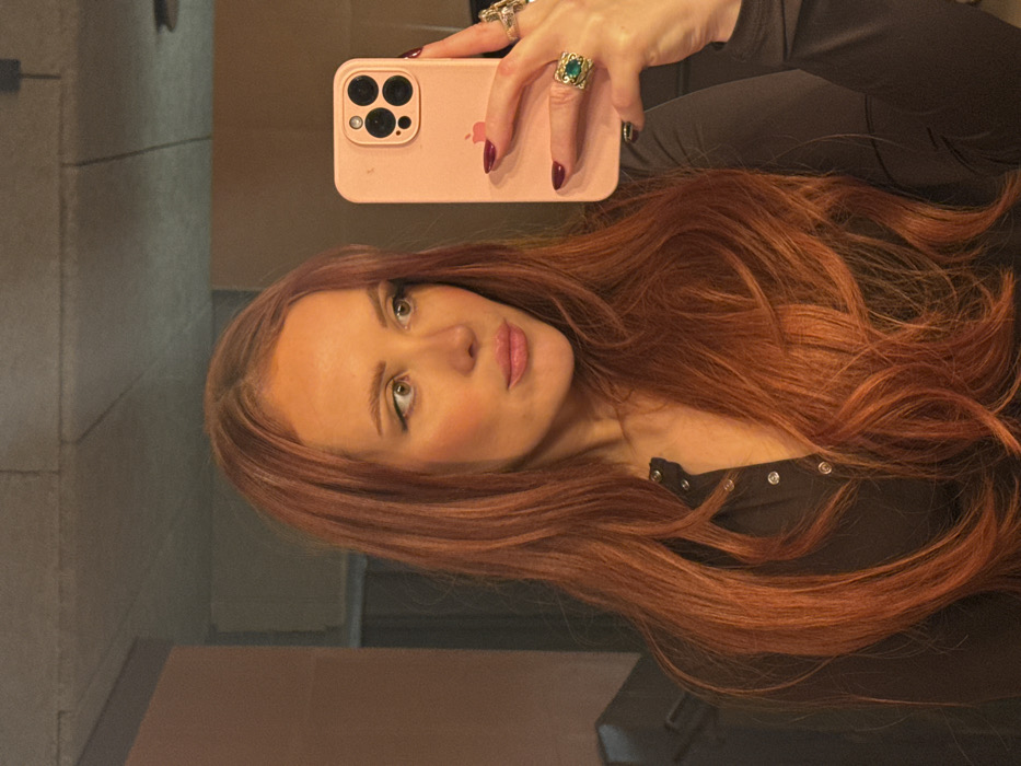A woman takes a selfie in a mirror. She holds a pink cell phone. Her red hair is wavy and shoulder-length. She wears rings with gemstones. She has fair skin, and her makeup includes eyeliner and lipstick. The background includes a wall and a glimpse of the woman's dark clothing. The photo is slightly rotated.