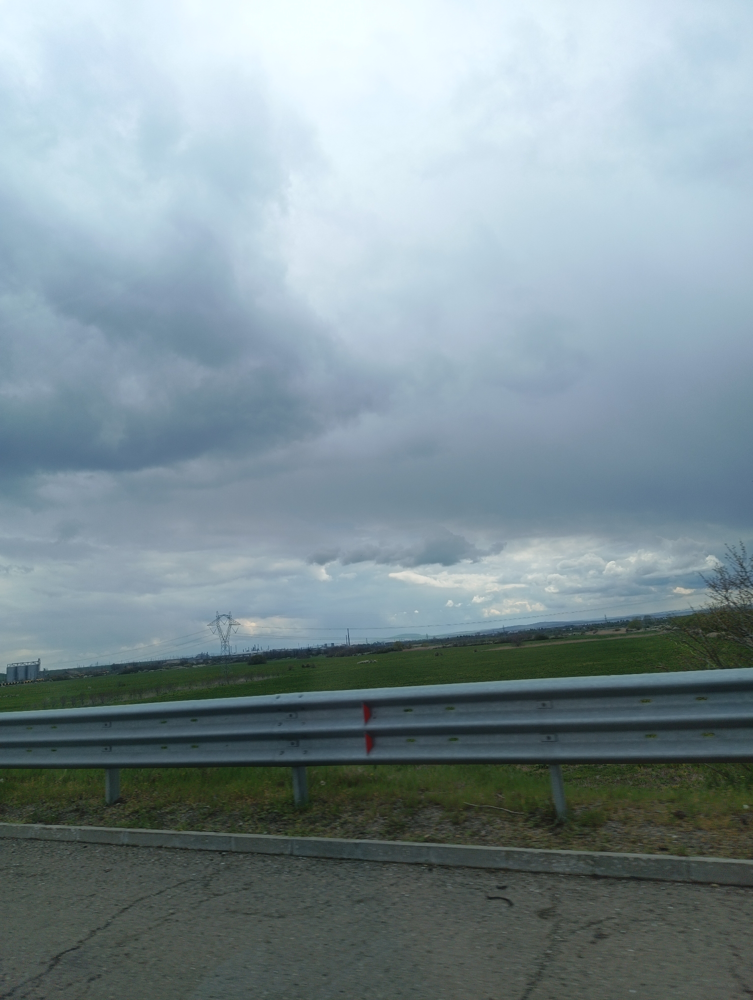The image depicts a rural landscape under a cloudy sky. In the foreground, a grey metal guardrail flanks an asphalt road with visible cracks. Beyond the guardrail, a grassy verge separates the road from a green field. In the middle distance, an electrical transmission tower stands in the field. In the far distance, possibly a building or industrial structure is visible. The location appears to be near Bulgarovo, Bulgaria, as suggested by the presence of agricultural land and industrial infrastructure in the region. No people, explicit actions, or direct interactions are visible in the scene.