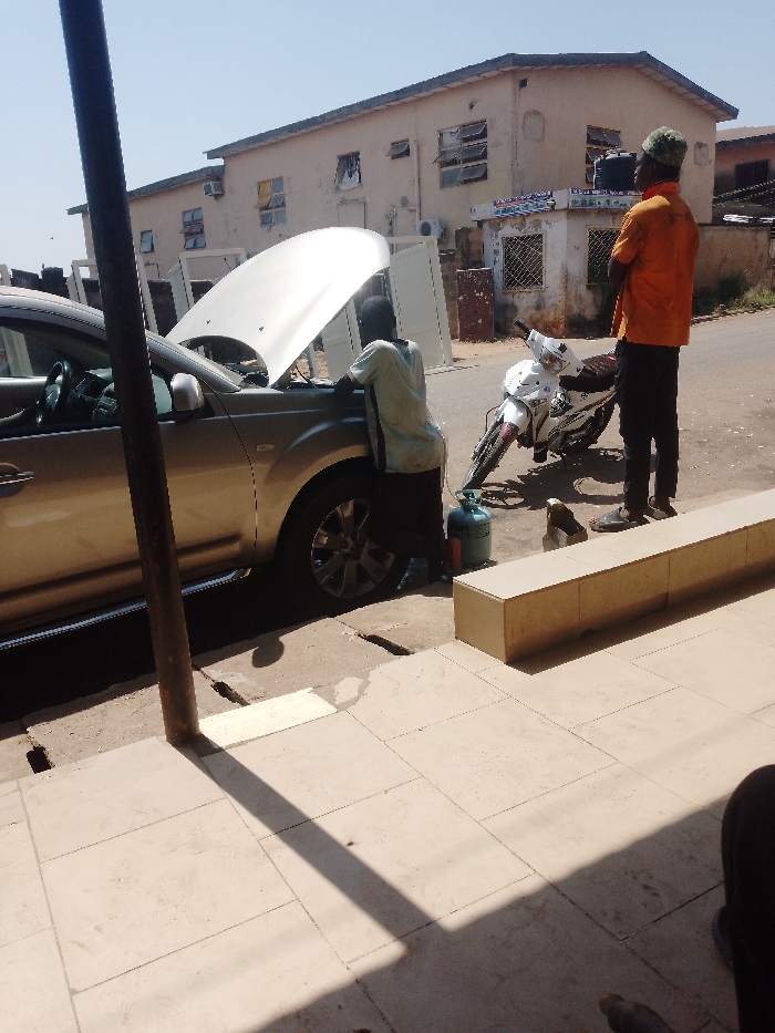 The scene depicts an outdoor urban setting in Sardauna, Nigeria, under bright sunlight, indicated by pronounced shadows. Two adult males are present near two vehicles. A silver-colored SUV is parked with its hood fully open, revealing the engine compartment. The front passenger door of the SUV appears slightly ajar. One male, wearing a light-colored t-shirt and dark trousers, is kneeling at the front-right fender of the SUV, facing partially away from the camera, and is actively examining or working within the open engine bay. On the ground near the SUV's front-right wheel, a light-green gas cylinder is visible. A second male, wearing an orange short-sleeved shirt, dark trousers, and a patterned cap, stands to the right of the SUV, facing left towards the general activity. He is positioned next to a white motorcycle with red accents on its front wheel, which is parked on the asphalt road, leaning on its kickstand. Several dark, unidentifiable objects are on the ground between the motorcycle and the gas cylinder. The immediate foreground features light-colored square paving tiles, partially shaded by a dark, vertical pole. A beige concrete bench or ledge runs horizontally across the lower-right portion of the frame. The ground transitions from tiled pavement to a concrete gutter, then to a dirt/gravel area, and finally to a darker asphalt road where the vehicles are situated. In the background, a two-story, light-brown building with multiple windows, some appearing broken or covered, stands on the opposite side of the road. An air conditioning unit is visible on its upper facade. Below the main building, a smaller structure with barred windows and a partially obscured sign is present. A large, white rectangular panel, possibly a gate or construction material, leans vertically near the background building.