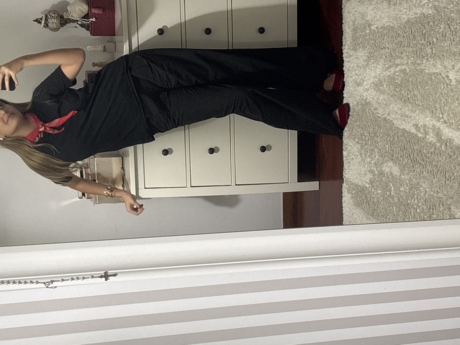 An interior scene depicts a female subject reflected in a mirror, located within a residence in Vila Nova de Gaia, Portugal. The subject has long light-colored hair and wears glasses. She is dressed in a black short-sleeved t-shirt, a red patterned bandana tied around her neck, black wide-leg trousers, and red flat shoes. A gold-toned bracelet is visible on her left wrist. She stands with her left arm resting on a light-colored dresser, which features three drawers, each with a dark round knob. In her right hand, she holds a dark-colored smartphone, capturing a mirror selfie. On the dresser's surface, various items are present, including a light-colored box, a red textured box, and a metallic decorative object. To the left, a silver rosary with a crucifix hangs from the vertically striped mirror frame. The flooring consists of dark wood, partially covered by a light-colored, shaggy rug. The background wall behind the dresser is plain light grey.