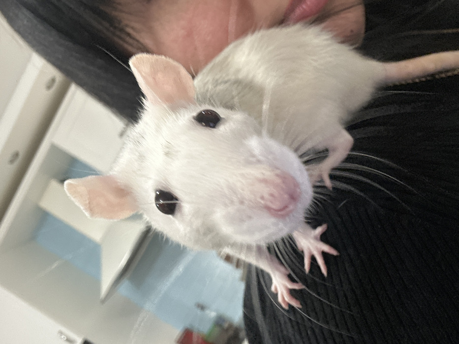- "A white rat with pink ears and black eyes perches on a person's shoulder, peering directly at the camera" by FM-3Fotg1, licensed under CC BY 4.0