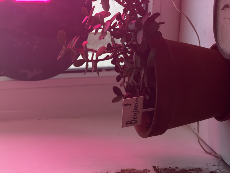 This indoor scene, located in Sergiyev Posad, Russia, features a potted plant illuminated by a prominent pink light source. The plant, appearing to be a succulent with numerous small, dark green, fleshy leaves, is housed in a terracotta-colored pot resting on a matching saucer. A small, white, rectangular plant marker is embedded in the soil, displaying the handwritten name "Benjamin" in black marker, accompanied by a small stick figure illustration above the text. The pot sits on a white windowsill. To the immediate left, a light-colored wall exhibits surface irregularities, suggestive of texture or minor damage. A thin white electrical cord runs along the base of this wall, extending towards the bottom left. Behind and partially above the plant, a window is visible, mostly obscured by a dark, circular object that reflects the pink light. In the bottom right corner, a portion of a white container, possibly a candle with a visible wick, rests on the windowsill. No individuals are present, and no specific actions or interactions are depicted within the frame.