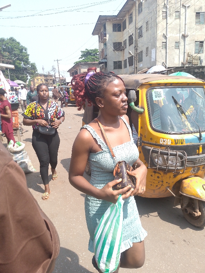 The image depicts a bustling daytime street scene in Onitsha, Nigeria, characterized by human activity and urban infrastructure. In the foreground, a young adult female stands in profile, facing right. She has dark skin, braided hair with reddish-brown extensions secured by a purple scrunchie, and wears a light blue, smocked mini-dress. She holds a small brown patterned cross-body bag in both hands and a white and green striped plastic bag hangs from her left hand. To her immediate left, only the shoulder and arm of an individual in a brown garment are visible. In the mid-ground, slightly to the left of the main subject, another female walks from left to right, looking forward. She wears a colorful short-sleeved top with a vibrant pattern over black leggings and gold-colored sandals, carrying a black shoulder bag. To the right of the main subject, a yellow tricycle, commonly known as a "keke NAPEP," is parked or stopped. It has a blue stripe below its windshield, a black front grille, and a visible license plate "030 DIU." A QR code is affixed to its windshield. The background features numerous indistinct pedestrians walking along the street. Multi-story, light-colored concrete buildings with visible windows and security bars line the street, indicating a built-up urban area. Overhead, numerous utility poles and power lines crisscross the bright, clear sky. Elements consistent with a street market, such as a white sack on the left and various market stalls or umbrellas, are partially visible, suggesting commercial activity. The street itself appears to be a paved road.