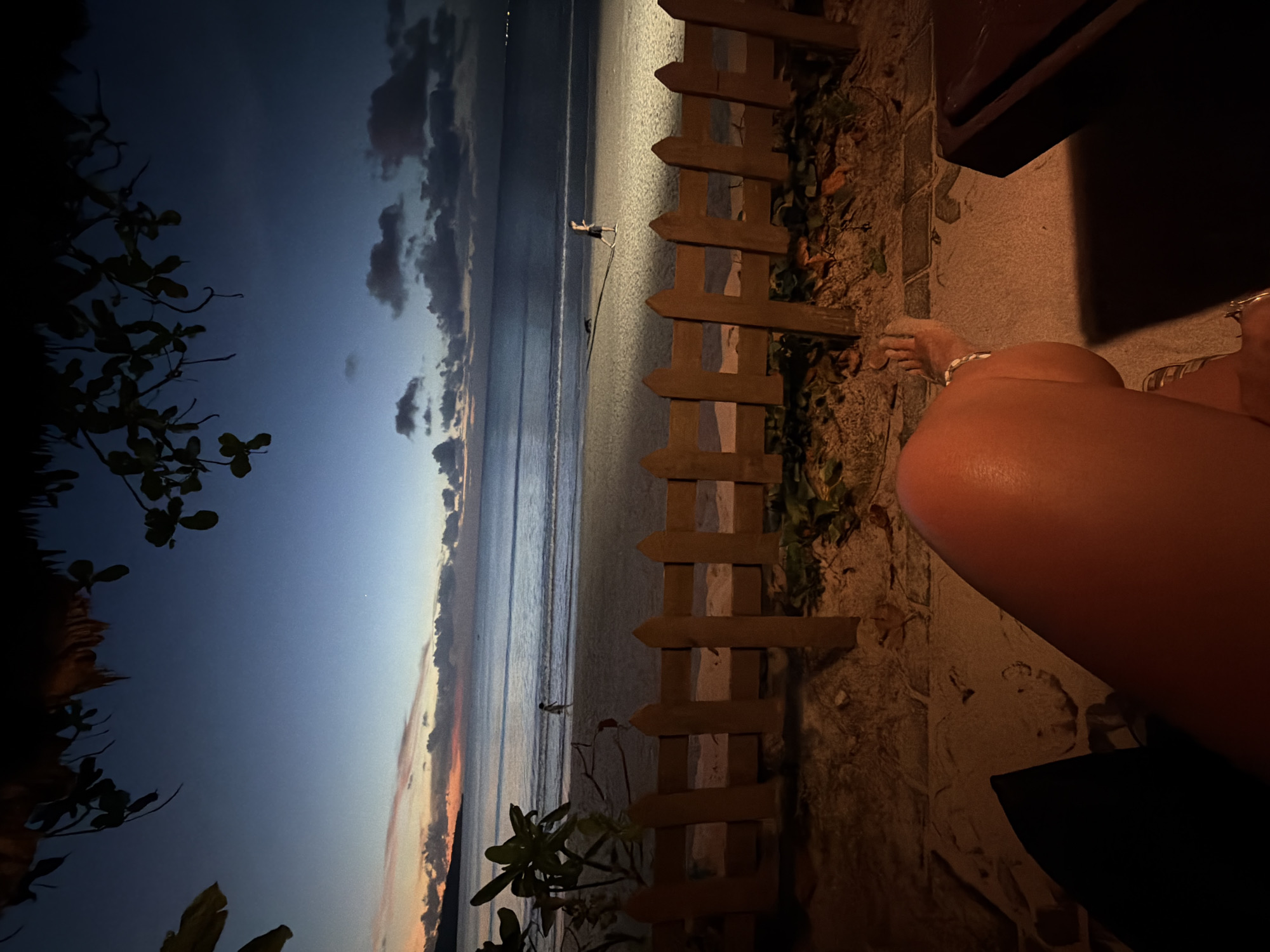 nighttime view of Jimbaran Bay in Jimbaran, Indonesia, looking towards the ocean. A wooden fence runs vertically through the center of the frame, separating the viewer from the beach. Beyond the fence, a sandy beach stretches to the water's edge, where small waves are visible. In the distance, a person stands in the water. The sky is a gradient of colors, transitioning from a deep blue at the top to a warm orange near the horizon. In the foreground to the right, a person's leg and ankle are visible, suggesting they are sitting or standing close to the fence. Leaves and vegetation frame the image on the left side.
