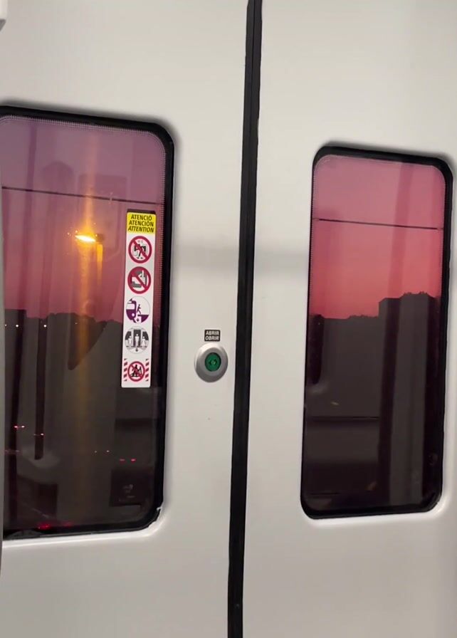 close-up of a closed train door from the inside. The door is white with two rectangular windows. The left window has safety symbols and a yellow warning sticker on it. There is a green button labeled "ABRIR OUVIR" (Open Listen) between the two windows. The windows reflect the outside, which appears to be dusk or dawn, with a pink sky and silhouettes of buildings. As the video progresses, the pink reflection slowly fades to black. The train appears to be in motion.