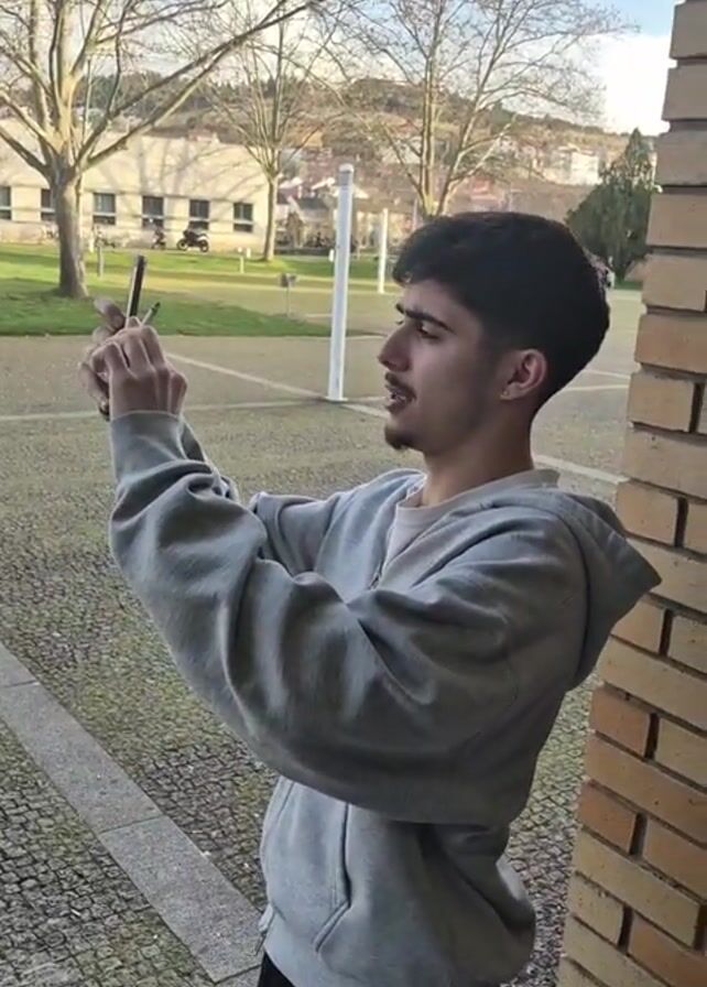 A young man in a gray hooded sweatshirt and black pants stands outside, holding a smartphone up to take a video or photo. He is leaning against a brick wall, and his face is turned to the right, with a concentrated expression. In the background, there is a paved area, some trees without leaves, a building, and a blue sky.