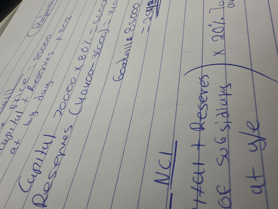 A white, lined sheet of paper is depicted at a diagonal angle, displaying handwritten notes in blue ink. The visible text includes financial or accounting calculations and terminology: "Capital Price - 85000," "Capital + Reserves at buy day," "Capital Reserves 70000 x 80% = 56000," "(40400-36000) = 4400," "Goodwill: 85000," an underlined "NCI," and "Reserves x 20%." The paper is evenly illuminated. No individuals, actions, or interactions are present in the frame. The scene is located indoors in Latsia, Cyprus.