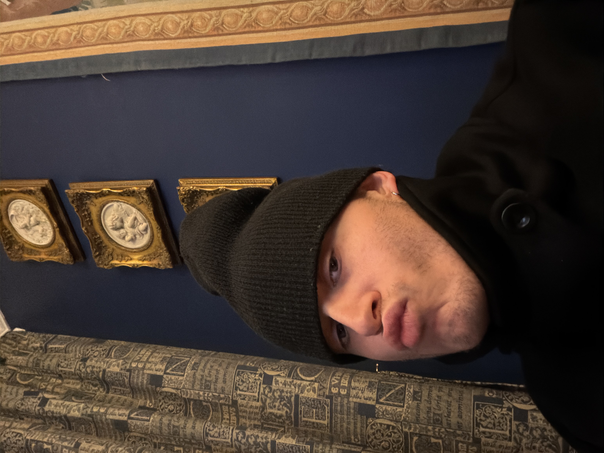 A person wearing a black beanie and coat is positioned in front of a blue wall. Above the wall is a patterned border. Below the wall, a patterned fabric or tapestry is visible. Three framed circular art pieces with gold frames are mounted on the wall. Text is visible in the patterned fabric. It cannot be determined whether the subject is located in City of Edinburgh, United Kingdom.