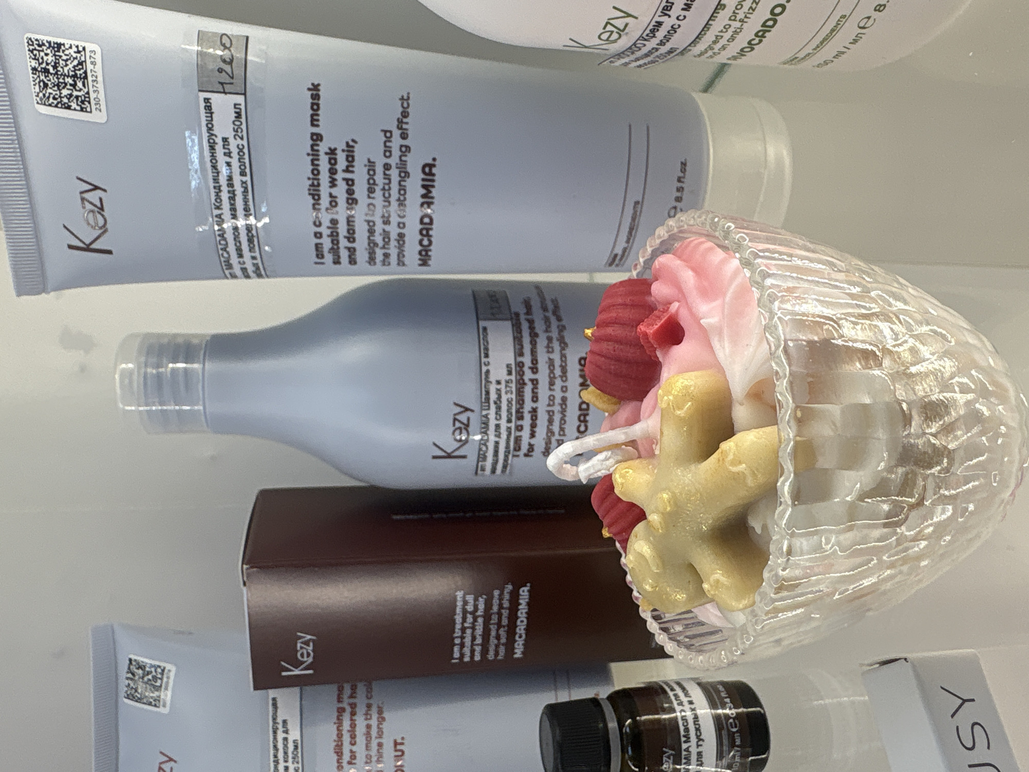 selection of hair care products from the brand "Kezy". Dominating the composition is a tube of "Kezy" conditioning mask for weak and damaged hair, with the text "MACADAMIA" prominently displayed. Next to it is a bottle of "Kezy" shampoo, also with "MACADAMIA." Below them are a brown box and a small bottle of hair oil from the same brand. A decorative glass container filled with what appears to be artificial food, likely a candle in the form of a dessert, adds a touch of visual interest to the scene. The products are displayed on a white surface, suggesting a shop shelf or a product showcase, likely in Perm, Russia, based on the Cyrillic script on the product labels.