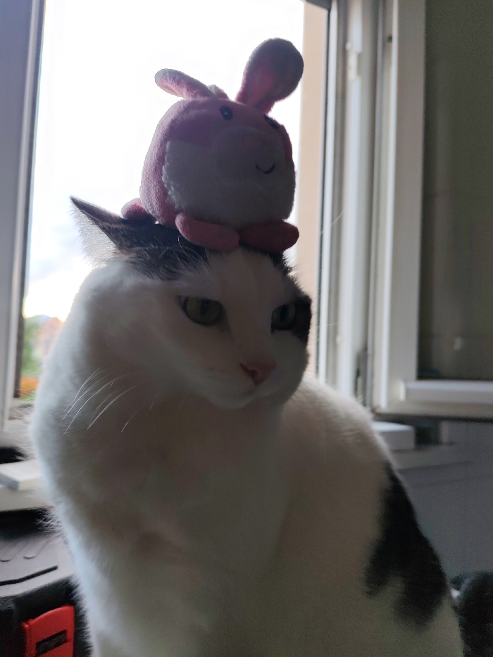 A bicolor cat, predominantly white with black patches on its head and body, sits upright facing slightly right of the frame. A small, pink plush toy, resembling a rabbit with stitched facial features, is balanced directly on the cat's head. The cat has green eyes and a pink nose, displaying a neutral expression. The scene is illuminated by strong backlight from a window immediately behind the cat, which features a white frame. Through the window, a bright, featureless sky and faint, blurred distant structures are visible, indicating an outdoor environment. The setting is an indoor space within the city of Bischheim, France.