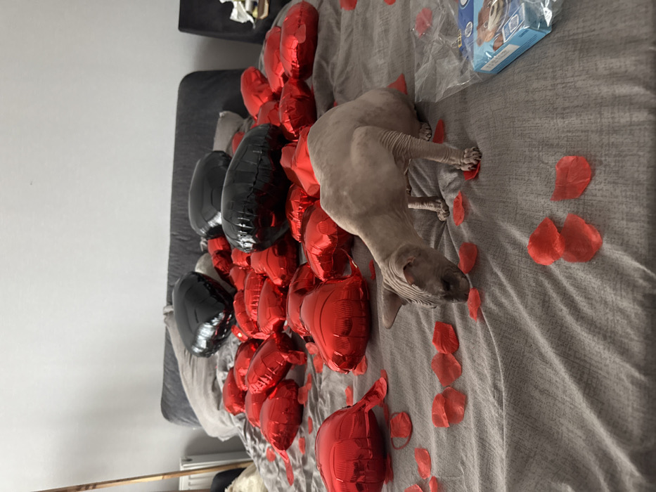 The scene is set in an indoor bedroom in Tbilisi, Georgia. A light tan Sphynx cat stands on a grey textured bedspread, positioned in the foreground with its head lowered, appearing to investigate scattered red fabric petals. The bed is extensively decorated with numerous heart-shaped foil balloons; a large cluster of red balloons occupies the central and far sections of the bed, interspersed with at least three black heart-shaped balloons towards the dark grey upholstered headboard. A clear plastic bag containing a small blue package is visible on the right side of the bed. The background features a plain light-colored wall and a white radiator or heating unit on the far left. No individuals are present.