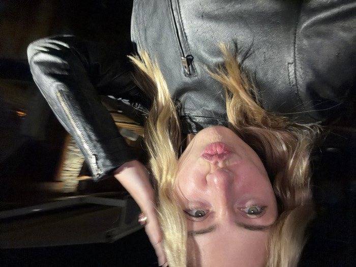 A female individual is depicted in a close-up, chest-up image, appearing to take a selfie in La Clusaz, France. She has light-colored hair, appearing blonde, and light-colored eyes, seemingly green. Her lips are pursed into a "kiss" shape, and her head is tilted slightly. She is wearing a black leather jacket with a central zipper and a prominent zipper running down the outer side of her left sleeve. Her right hand, adorned with a ring on the ring finger, is raised and positioned near or in her hair. The background is largely obscured by darkness and motion blur, but indistinct structural elements are visible to the upper right, including a light-colored horizontal beam or awning support and a blurred, textured surface beneath it, indicative of a nighttime outdoor or semi-outdoor environment.