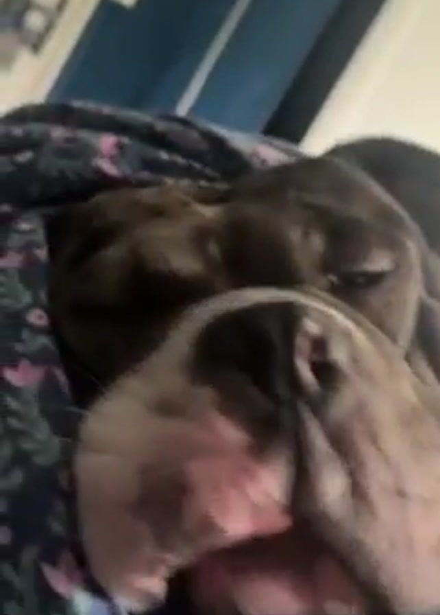 close-up of a sleeping bulldog. The dog is lying on a bed covered with a navy blue blanket with a pink floral pattern. The dog has dark brown fur with a white and pink nose. The dog opens its mouth wide in a yawn, sticking its tongue out. The background is out of focus, but a blue wall and a lamp can be seen.