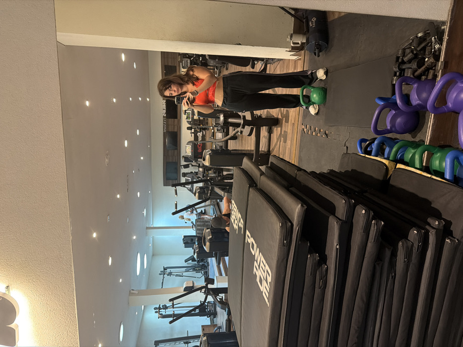 The image depicts the interior of a gym in Pinamar, Argentina, captured as a mirror selfie